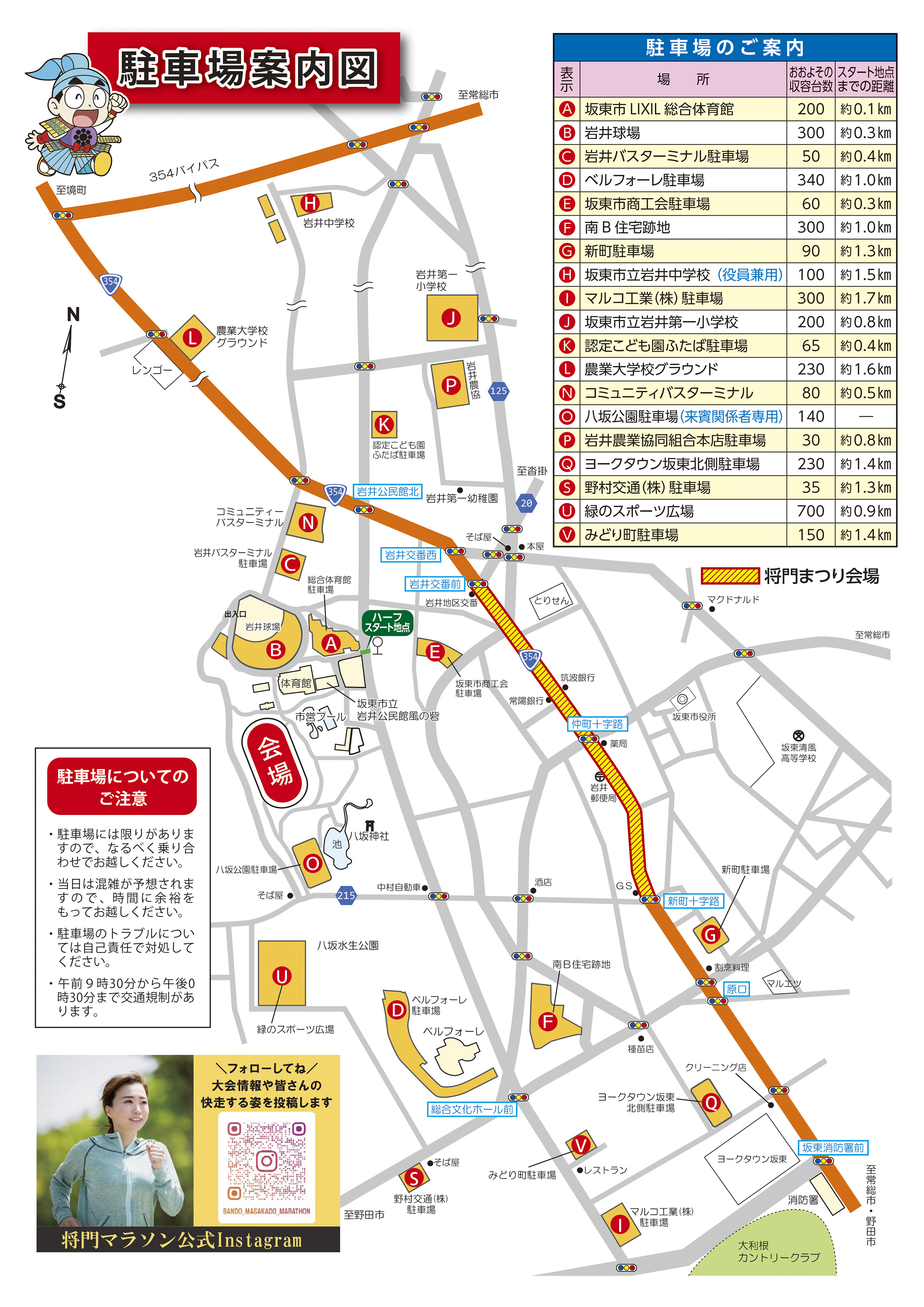 案内図には、各駐車場からスタート位置までの距離を表示してありますので、参考にしてください。